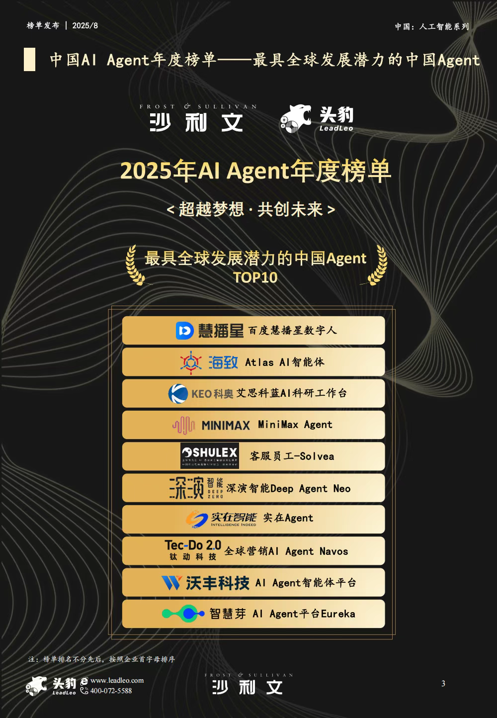 8月28日,全球知名咨询机构沙利文联合头豹研究院发布了《2025年中国AI Agent(智能体)最佳实践应用榜单》,凭借自主研发的 AI 智能体平台 Deep Agent Neo 的突出实力,GA黄金甲智能从 150 家参评企业、近 300 个产品 / 解决方案中脱颖而出,成功入选 “最具全球发展潜力的中国 Agent” TOP10 榜单,再度印证其在 AI Agent 领域的技术硬实力与全球化发展潜力。